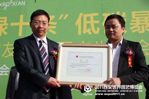 西安世园会筹备办代表向世园会官方网站域名捐赠者——陕西蒙古包网络有限公司总经理杜领群(左)颁发荣誉证书